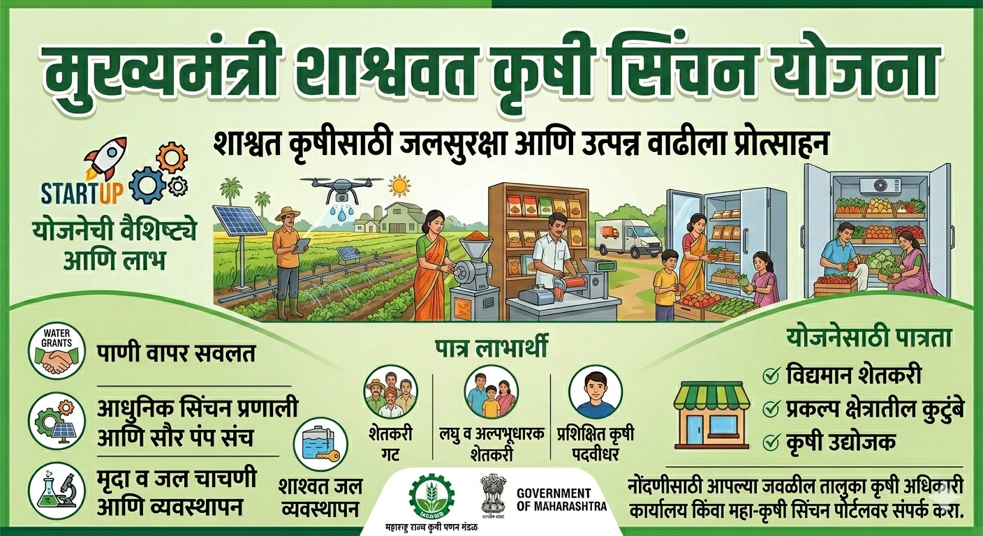 - Chief Minister Sustainable Agriculture Irrigation Scheme – Magel Tyala Shettale (Individual Farm Pond) मुख्यमंत्री शाश्वत कृषी सिंचन योजना – मागेल त्याला शेततळे (वैयक्तिक शेततळे)