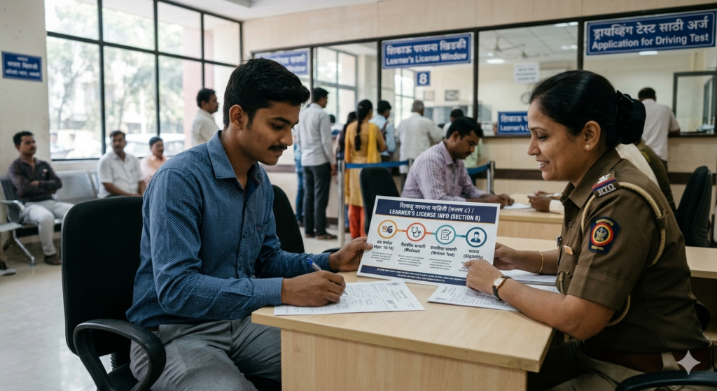 - कोणत्याही व्यक्तीला वाहन चालवण्याचे प्रशिक्षण घेण्यासाठी ‘लर्निंग लायसन्स’ मिळवण्यासाठी अर्ज करता येतो.