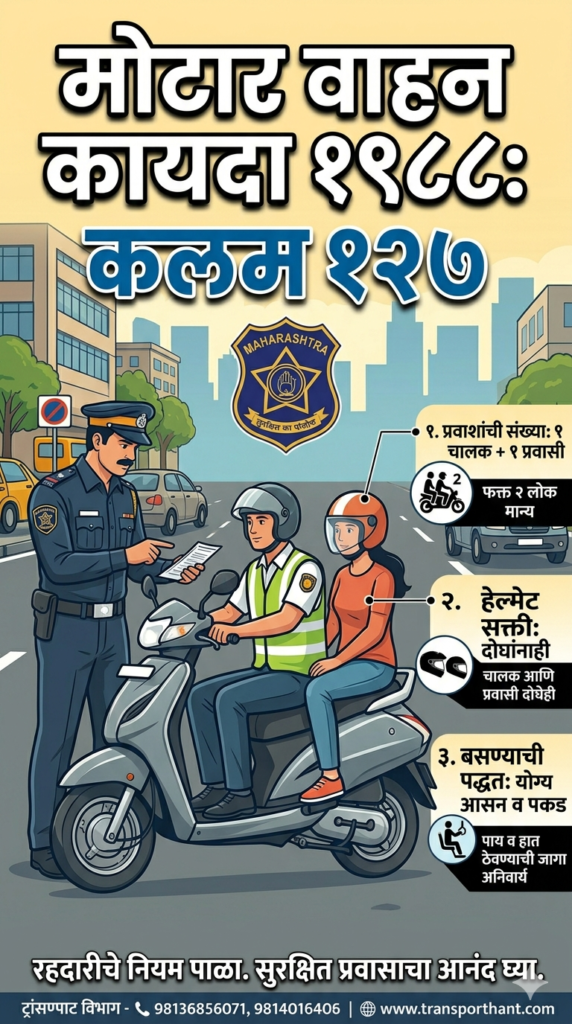 १. हेल्मेटची सक्ती: जरी हे कलम आसन व्यवस्थेबद्दल असले तरी, कलम १२९ नुसार चालक आणि मागे बसणाऱ्या अशा दोघांनाही ISI मार्क असलेले हेल्मेट घालणे अनिवार्य आहे. २. लहान मुले: कायद्यानुसार ४ वर्षांवरील मुलाला स्वतंत्र प्रवासी मानले जाते. अलीकडील नियमांनुसार, लहान मुलाला दुचाकीवर नेताना विशिष्ट वेगमर्यादा आणि सेफ्टी हार्नेस (Safety Harness) वापरणे आवश्यक आहे.